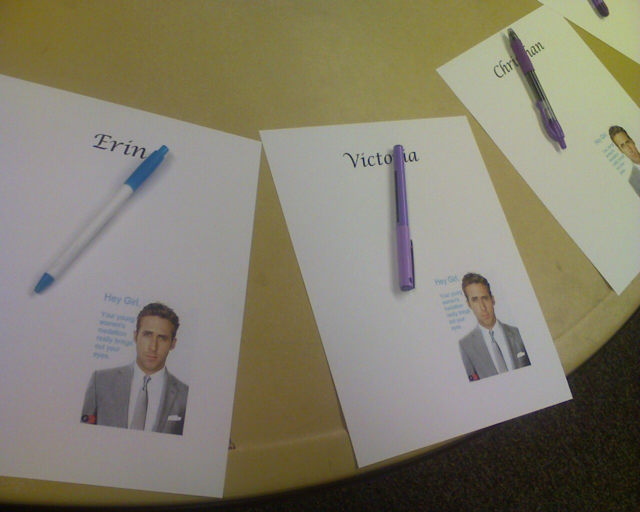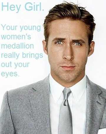 Sister McGrath printed off a sheet for each girl with their name on the top. She also added a cute picture of Ryan Gosling saying “Hey girl – your YW Medallion really brings out your eyes” (see photos below). She laid them all out on a table with pens and had the girls (and leaders) go around to each paper and write down at least one positive quality for every girl. The girls loved this and spent a long time writing nice things about each other.