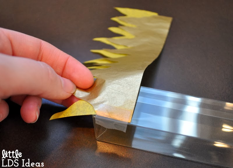 Then attach them to your ‘torch’I staggered my tissue paper a little, so the yellow and gold didn’t match up exactly.With a piece of tape, attach your flames and then wrap it around the container.Place a small piece of tape where the tissue paper ends.And you’ve got your torch and flames!