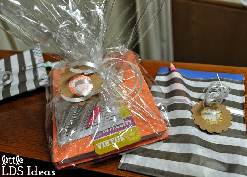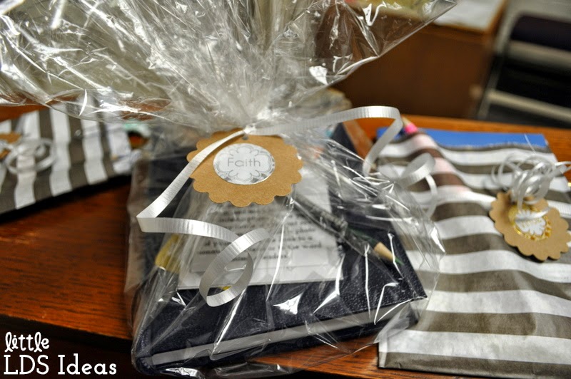 I read through the Personal Progress booklet and picked out 8 value experiences. Then I went to the Distribution Center & Target and picked up any supplies that the girls needed for those 8 value experiences. I picked up things like notebooks, pencils, scripture markers, Conference Ensign, New Era, For the Strength of Youth pamphlet, a Book of Mormon, etc. Some of the experiences asked to read the Proclamation. I wanted to give the girls a small Proclamation, but couldn’t find any, so I created my own. I have them for purchase in my Etsy Shop.