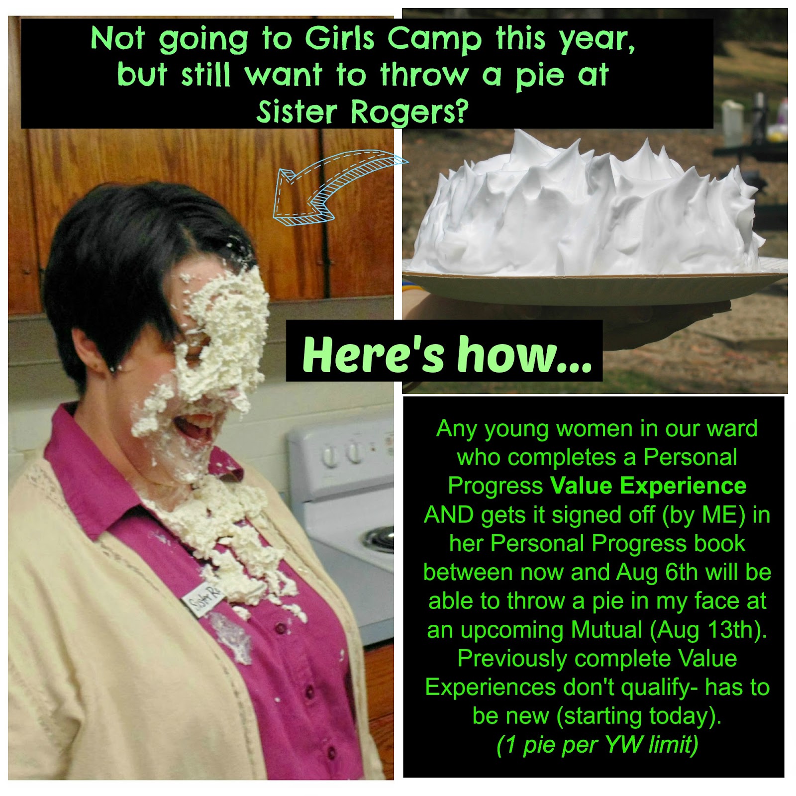 I also provided an alternative for those girls who didn’t go to Girls Camp (for whatever reason) – if they completed ONE new Personal Progress Value Experience before the Stakewide post- Girls Camp fireside (and I personally signed it off for them) they could also qualify to throw a pie at my face.