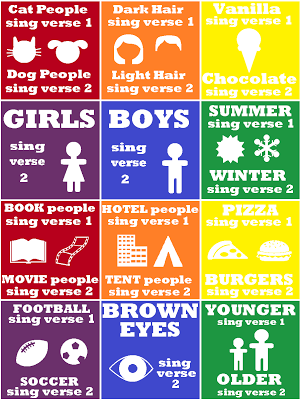 To review “A Child’s Prayer,” or other two part songs, print the document below, cut out the pieces and draw them from a bowl one at a time.  Have the children decide which category they fit (most closely) into and have them sing the song accordingly.  Use this activity as an opportunity to discuss that we are all different and Heavenly Father knows and loves all of us.  Don’t allow the activity to turn into a competition.