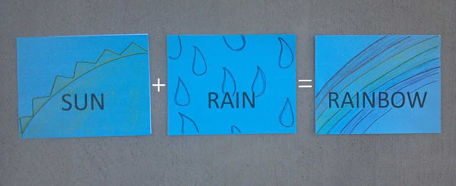 Second, tell them there’s an equation to make a rainbow. Put up the blue signs (well, mine are blue, yours can be whatever you want) and say “You need sun… plus rain…. to make a rainbow!” (I taped them to the chalkboard and drew a plus sign after “sun” and an equal sign after “rain”). Go however in-depth you feel appropriate on how refraction works and whatnot. It’s not a science lesson, so I gave it a proper skim-over.