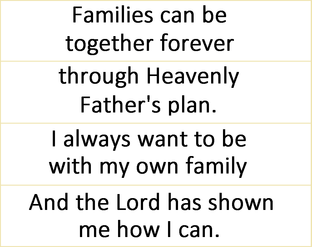 Tell the children that they need to learn the song so well that they can recite it inside-out, backward and forward. They’re going to see if they can sing the song from the end to the beginning. Take the strip that reads “The Lord has shown me how I can.” and place it at the bottom of the piece of shelf paper. Explain that this is the last line of the song.