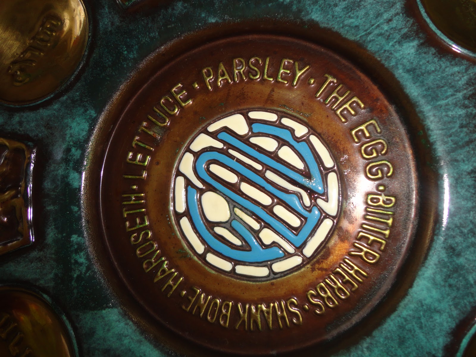 Here is a close up of the Seder Plate. I placed each of the food items in the appropriate place and the 3 Matzo Crackers in the 3 slots below. Some families place the 3 Matzo Crackers in the fold of a napkin.