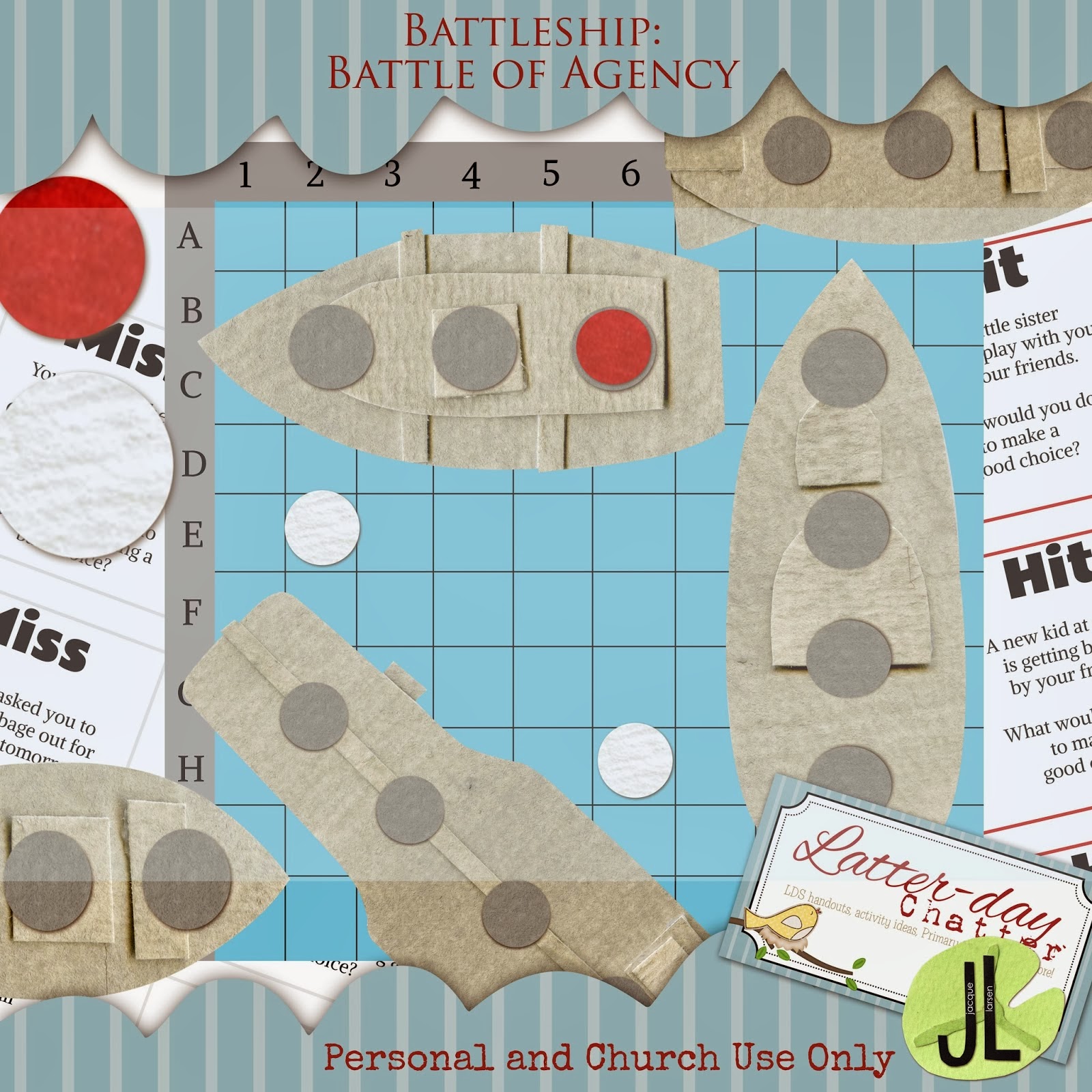 Jessica’s ‘Battle of Agency’ game includes a 2ft board with a key and 5 big ships to play a church version of the game Battleship. It includes 2 sheets of scenarios both hits and misses and blank sheets to add your own.Amazing!Just stop by Latter-Day Chatter, HERE to learn more about the game.