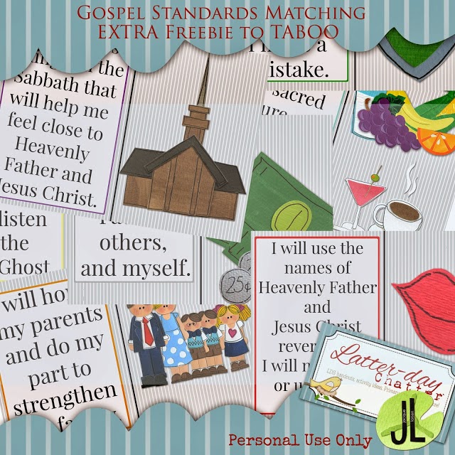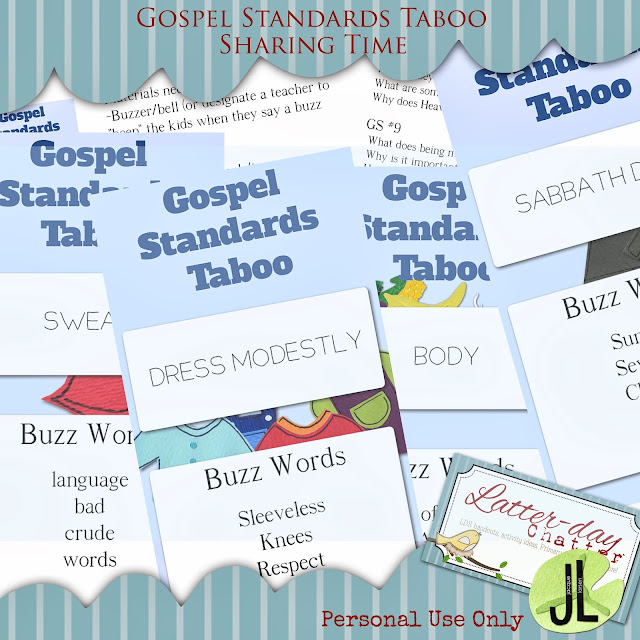 I have a great Sharing Time Idea to share with all of you today.Jessica of Latter-Day Chatter emailed me a few days ago asking if she could use my ‘Gospel Standards Taboo’ game. I said ‘Of Course!’ I love everything Jessica creates, so I knew the Taboo game she created would look awesome.She got to work & here’s a little sneak peek of what she created: