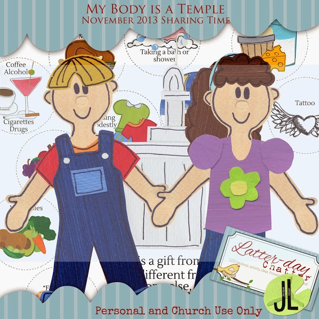 Sharing Time Ideas from Little LDS IdeasOpening:Have the children close their eyes and have them imagine their favorite temple. Have them think about what color it is, how many windows they see, how many spires, etc.While they have their eyes closed display pictures of different temples.Ask the children if all temples are the same. You could show them the different pictures of the temples and point out some differences.Next, read the scripture 1 Corinthians 3:16.Explain to the children that in this scripture it teaches us that our bodies are temples. Even though we are all different, just like each of the temples, our bodies are still sacred.When we visit the temple how do we act? Are we loud and noisy? Do we leave garbage on the lawns?Just as we take care of the temple, we are asked to take care of our own temples, our bodies, too. Today we are going to learn how we can care for our bodies.