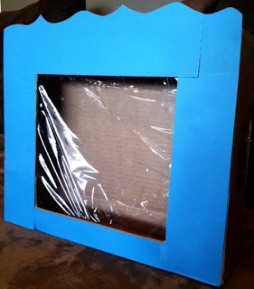 You will need a box or even a clear storage bin would work. Whatever you use you will be attempting to make a mini baptismal font. Here’s mine that I whipped up in 10 mins. (No judging! It’s not the prettiest, but I figured it would help explain what I meant).