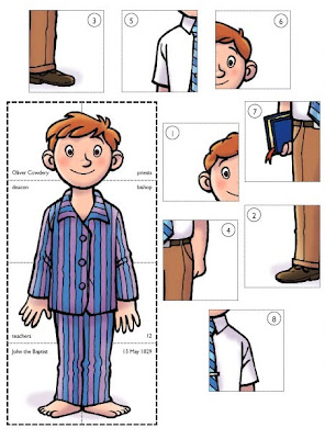 For today’s sharing time, the children are going to be helping this boy (picture above) get ready for church by answering questions about the priesthood.In the above picture the boy is separated into 8 squares. In each square you will see a word. The word in each square is an answer to 8 questions.If you decide to use this as your sharing time, I would make up a new set of questions and answers.You could make up questions about different ordinances like baptism, Gift of the Holy Ghost, the Sacrament, etc.You could also have stories about people that received a priesthood blessing. Read the story and then ask a question.