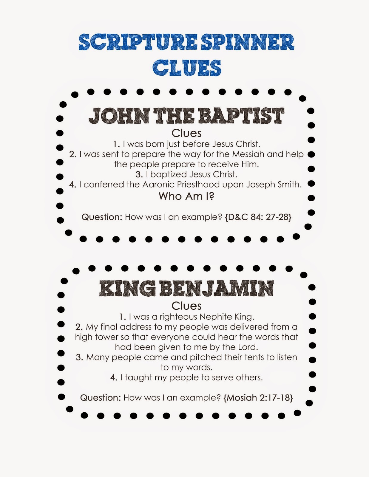 Inside of each envelope you will need to have an info sheet about that particular prophet. Have several clues listed about the prophet. You can have phrases about each prophet, scriptures, etc.I have included some ‘Scripture Spinner’ clues that you are welcome to use. Just click the link below!