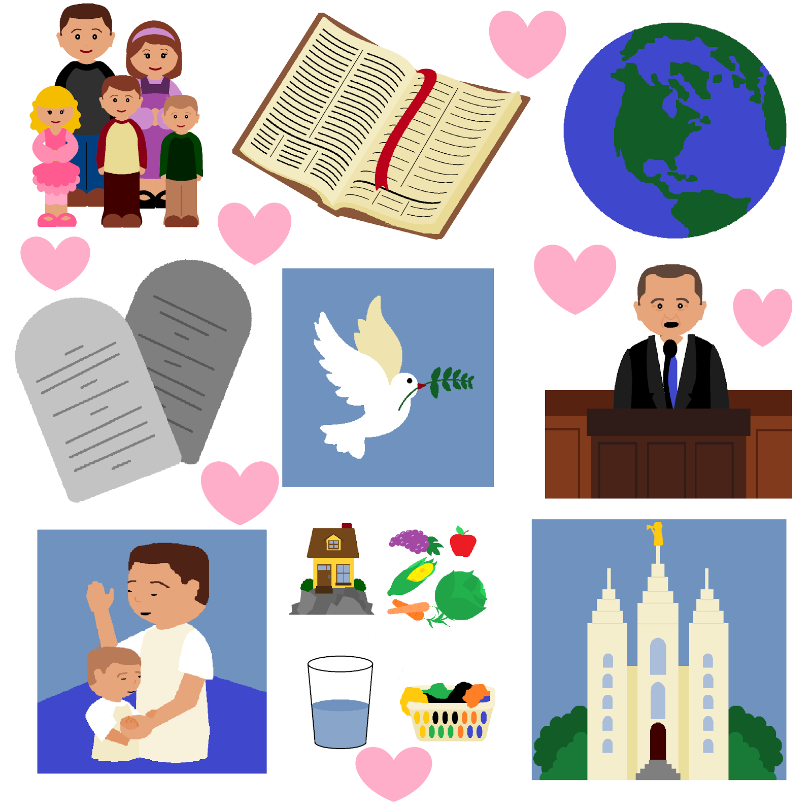 Ask the children whether you’ve turned all of the pictures over. Explain that three of the pictures don’t have anything on the back, because they mean exactly what the words say. Tell the children how we are literally children of our Heavenly Father. We are made up of both a body and a spirit. Our body has parents, our mother and father, but the parents of our spirit are literally our Heavenly Father and Heavenly Mother.