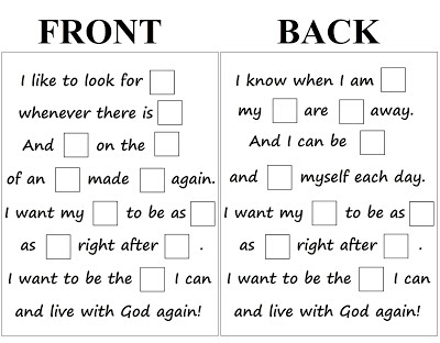 Have the children sing through the song, listening for the first missing word. Have one of the younger children see if he or she can find the picture that represents that word. Tape it in place and repeat until all of the boxes are filled. Use the pictures as a prompt to discuss the meaning of difficult words and concepts such as “ponder” and “forgiven.”