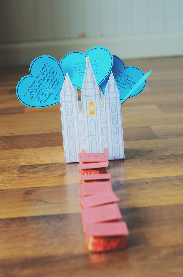 I taped my stepping stones to Dove chocolates, and the hearts are taped to popsicle sticks. You can find the wonderful temple printable here (which has so many applications – I’m thinking table decor, FHE lessons and more!), and the download for the stones and hearts below: