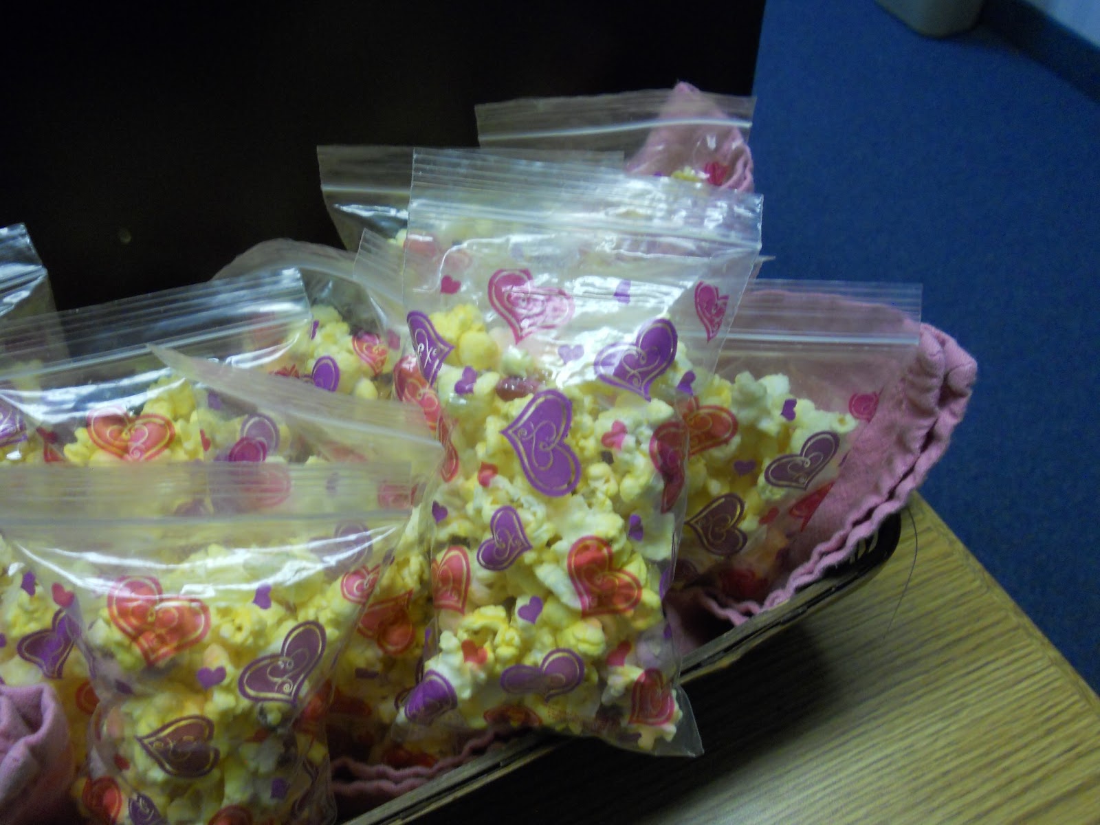 Microwave butter popcorn, valentine M&M’s, drizzled with white chocolate