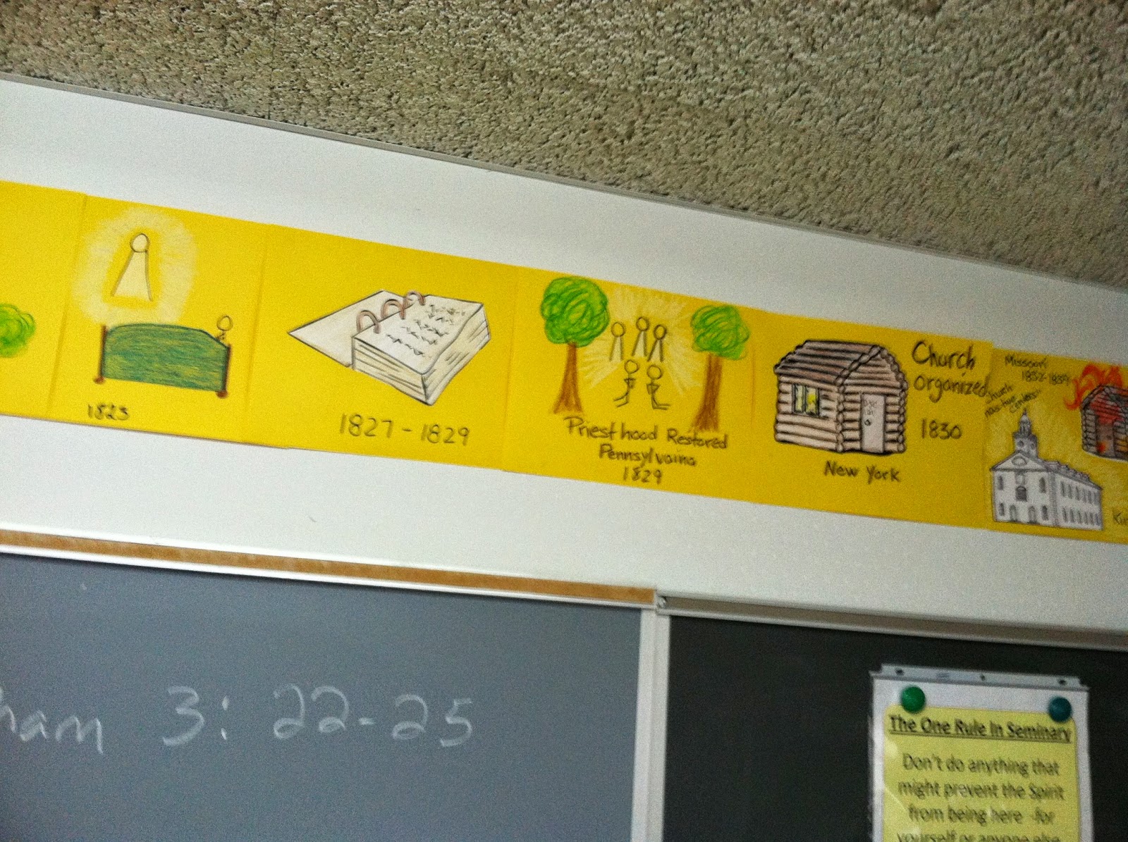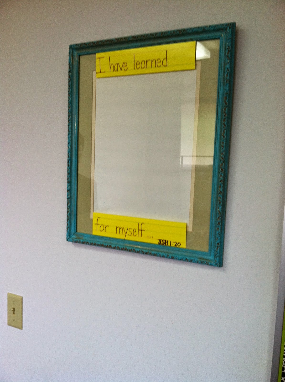 At the end of class, I will have them write one thing they learned that day and put it on the picture frame. The next day, our class president will take them down and give them to each student. The students will put them in their class journals. At the end of the year, they can look back and see their testimonies have grown!