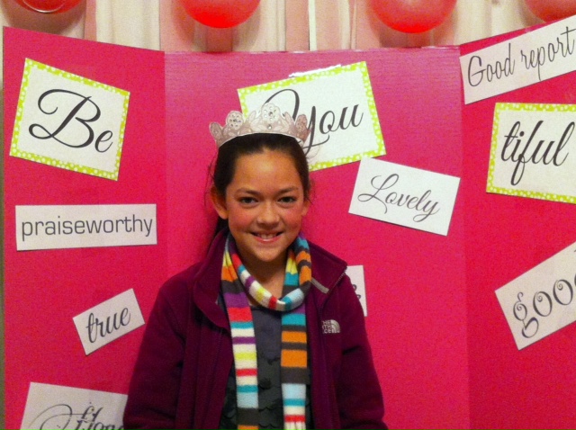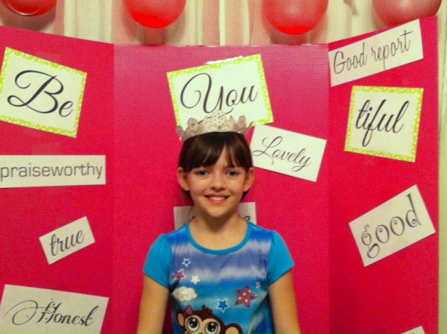 Then we took a picture in the “beauty booth”. I just took a trifold display board, like for science fairs, but it was PINK! (Hobby Lobby, if you want to know where I got it.) I simply added the caption Be-“You”-Tiful and then the attributes listed in the 13th article of faith. Here are a couple of shots of my own girls.