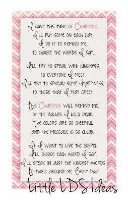 But if you decide to use this handout and don’t need the space on the bottom, no worries! I also created a tag without the space at the bottom. Just punch a hole at the top of the handout and attach it to the chapstick with a cute ribbon.The girls really liked the chapstick & I hope when they use it they can remember the lesson and try to be careful of the words that they use.