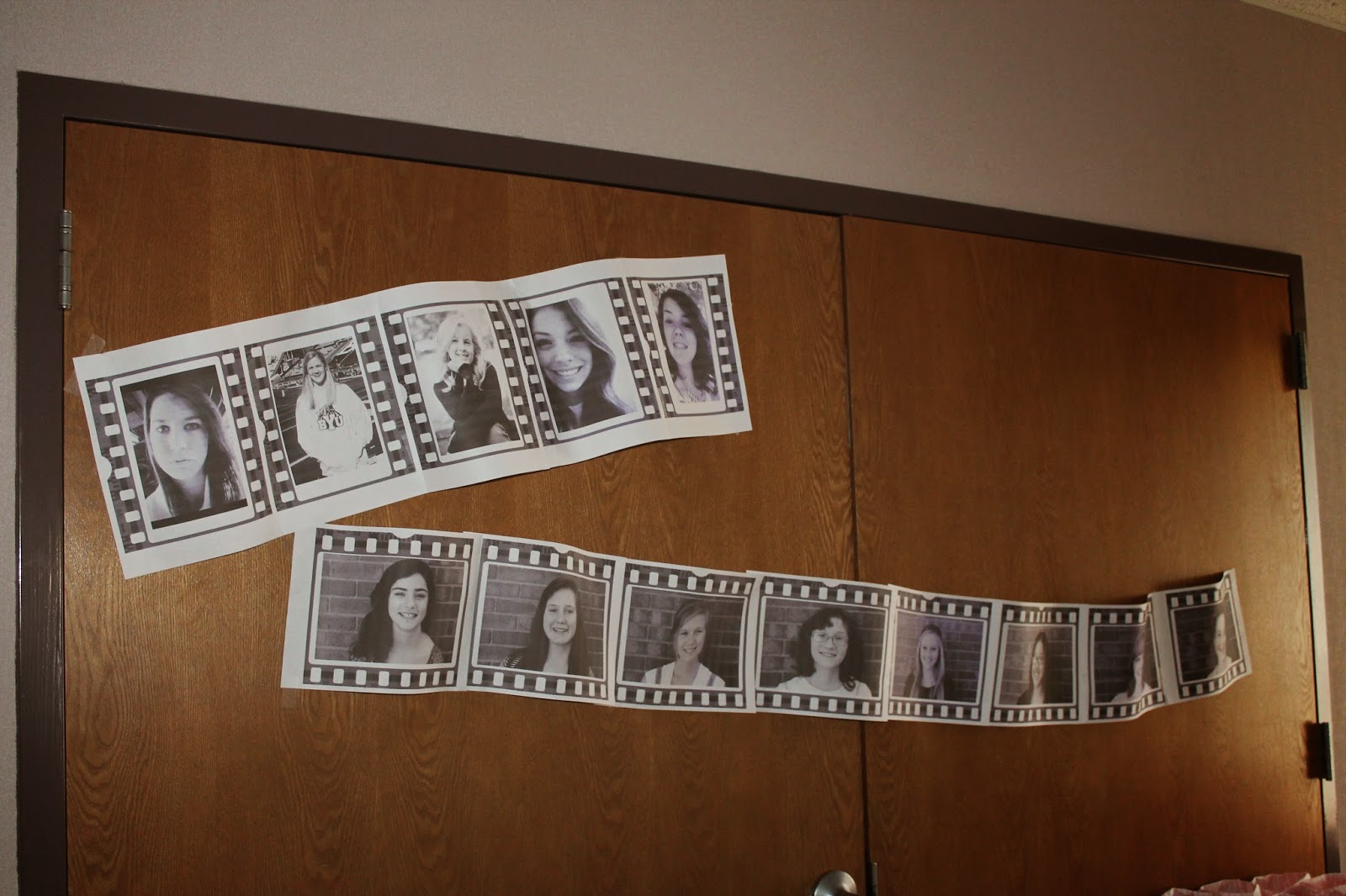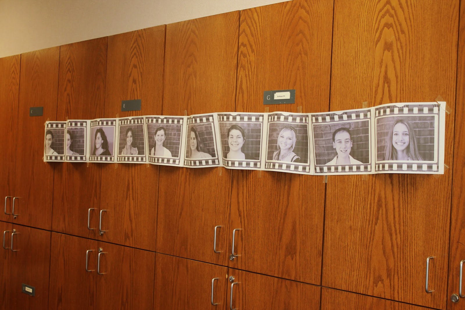 The girls head shots printed on paper and made to look like a filmstrip around the room.