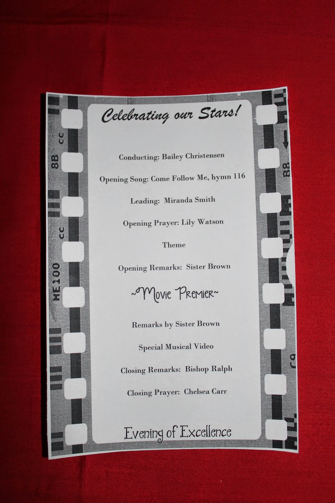 We filmed a 30 sec clip of all the girls telling/showing us what they did for their project/experience. Then, we set up a “movie” in the Relief Society room. Had a red carpet, movie projector screen, and popcorn bar.