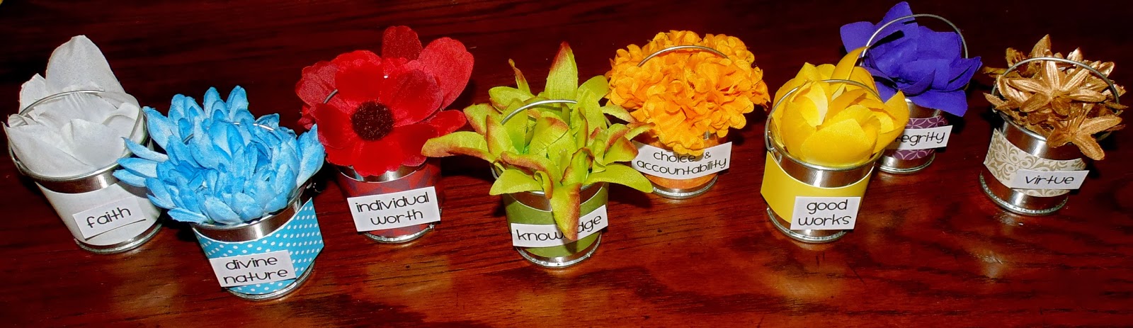 To solve the problem, I made these little ‘theme’ buckets using mini metal buckets (Walmart $1.00 each). I hot-glued a fake flower (matching the color for each monthly theme) inside each bucket. I couldn’t find gold flowers, but I had some gold spray-paint, so I improvised. Then I attached the name of the theme to the front of the buckets using scrapbook paper & double-stick tape. We put the corresponding bucket beside the poster we display for the month. You could also use the entire set for display during New Beginnings or YWIE.
