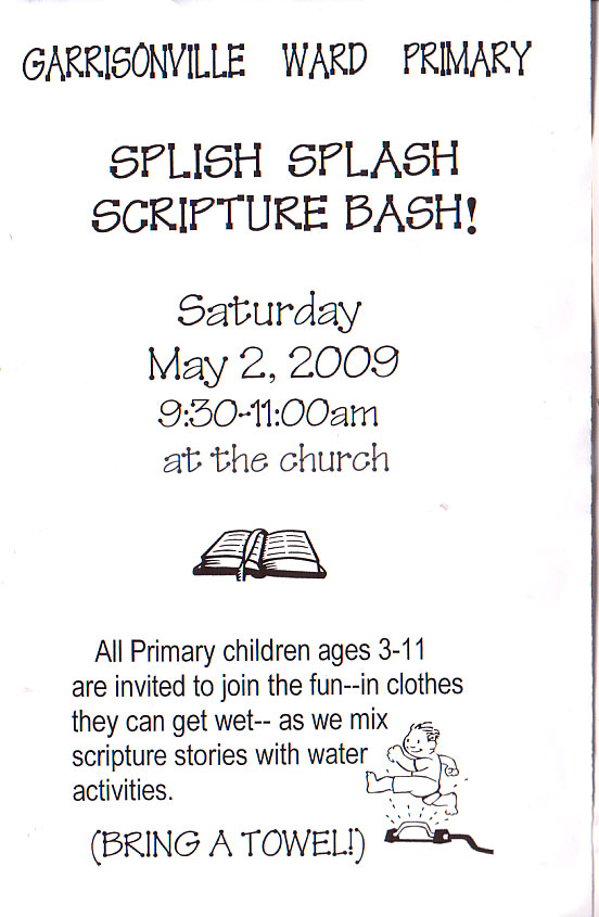 Another ward held a “Splish Splash Scripture Bash”. I stole a flyer because it sounded like so much fun and tried to get more information, but this was all I could get…. It sounds like it was great fun. Everyone ages 3-11 was invited.