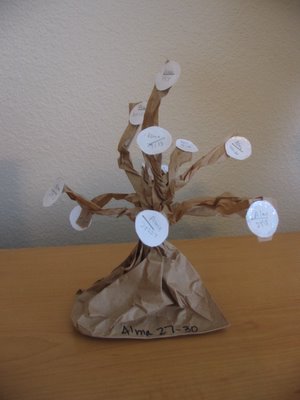 The kids searched through Alma 27-30 and wrote on their “fruit” their favorite most strengthening verses from those four chapters. We then stapled the “delicious fruit” to their individual trees. All in all, a good day!