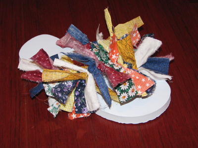 Gather fabric scraps in the young women’s value colors: whie, blue, red, green, orange, yellow, purple, and gold. Each shoe takes approximately 27 fabric strips measuring 1 inch by 8 inches.