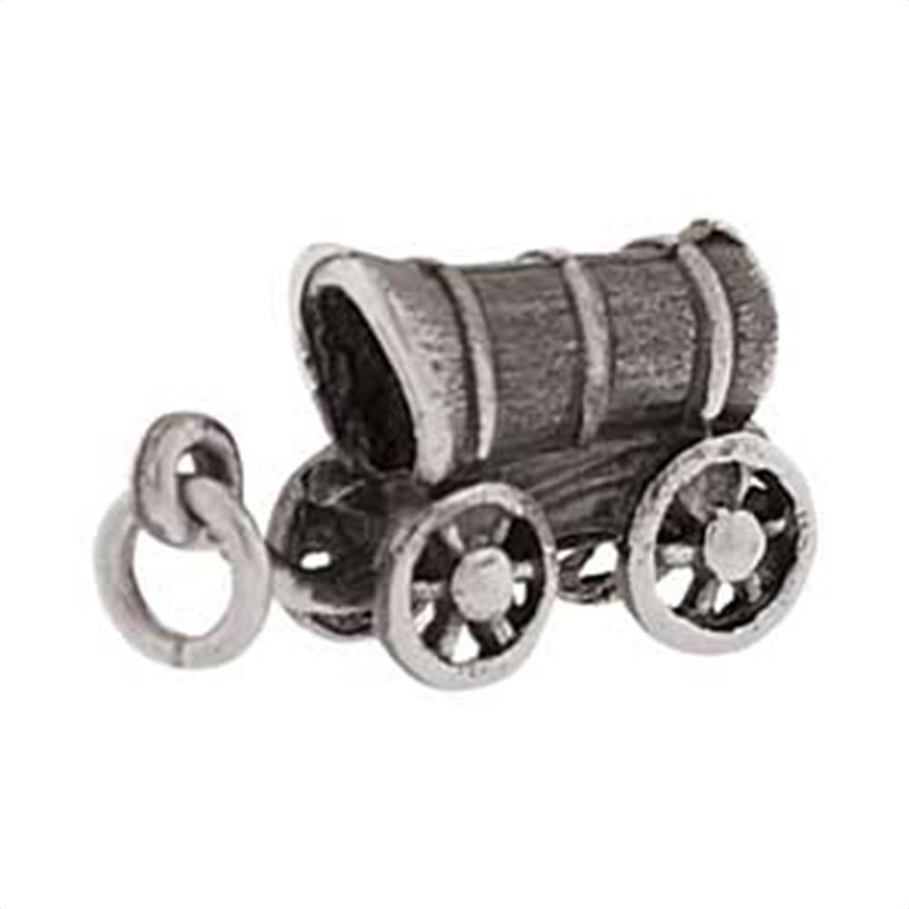 The designer LDS Charm, Pioneer Covered Wagon Charm, is made of silver plated metal alloy.
