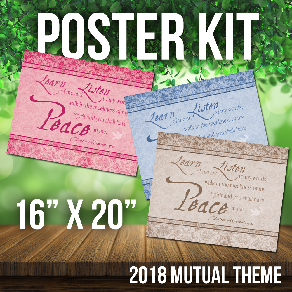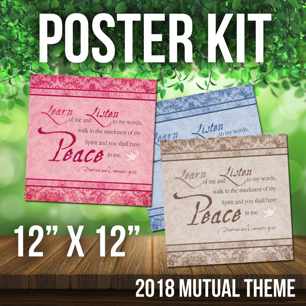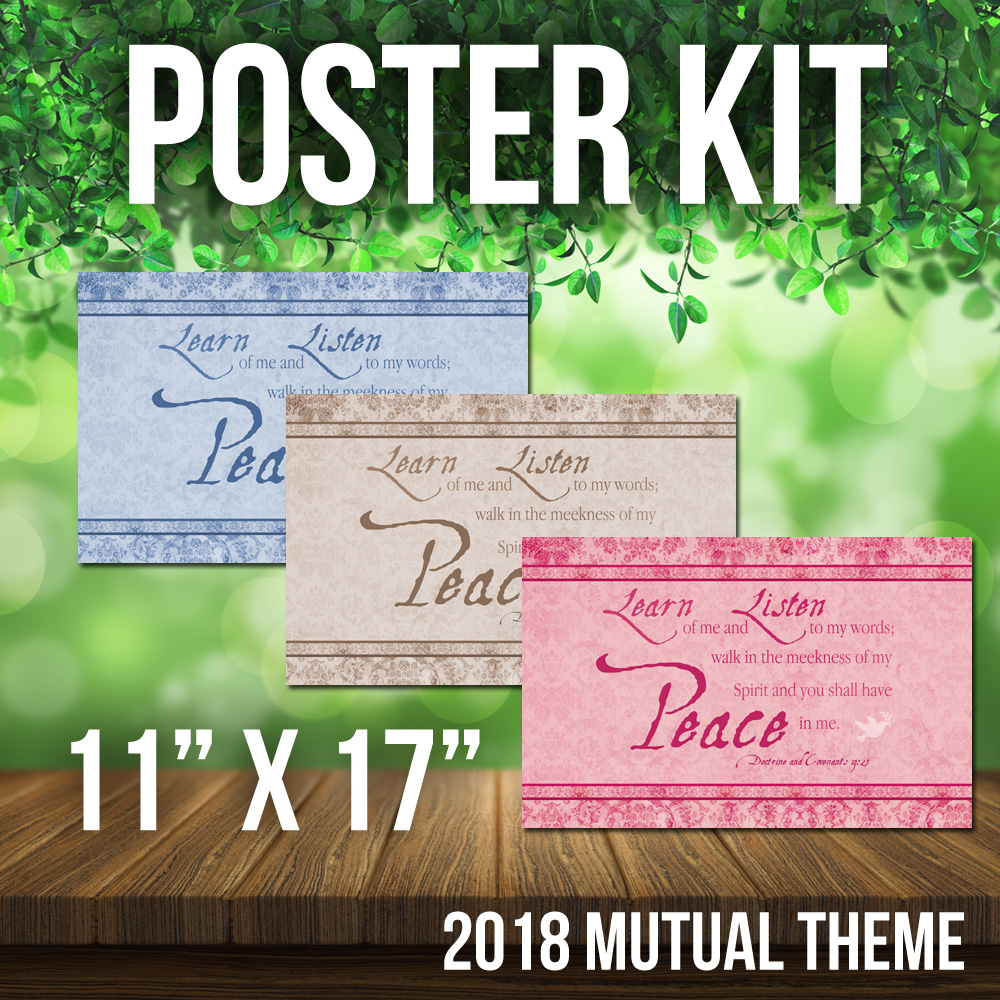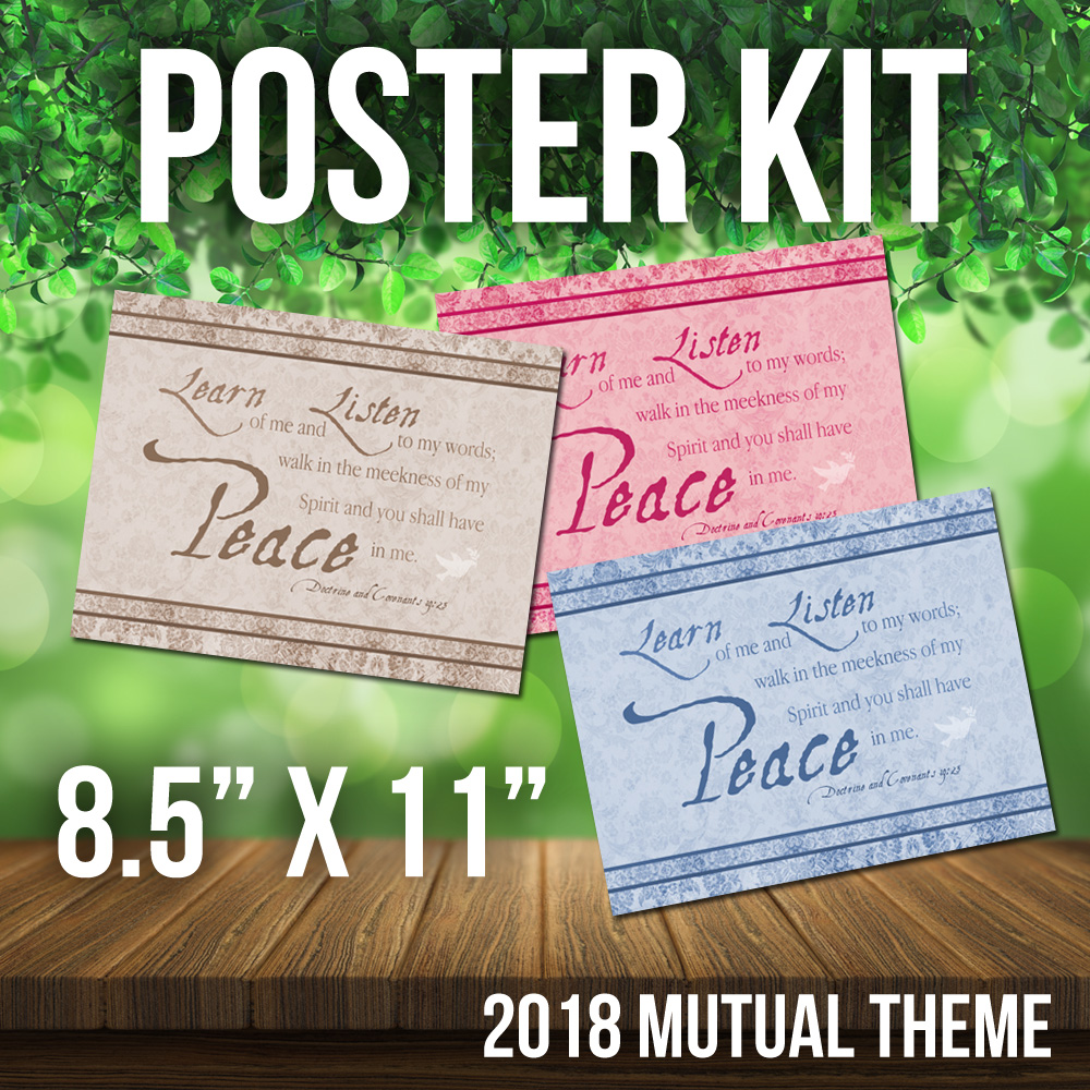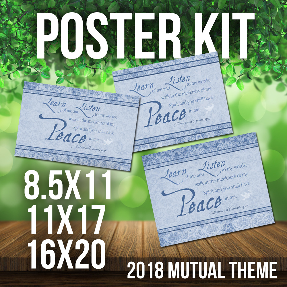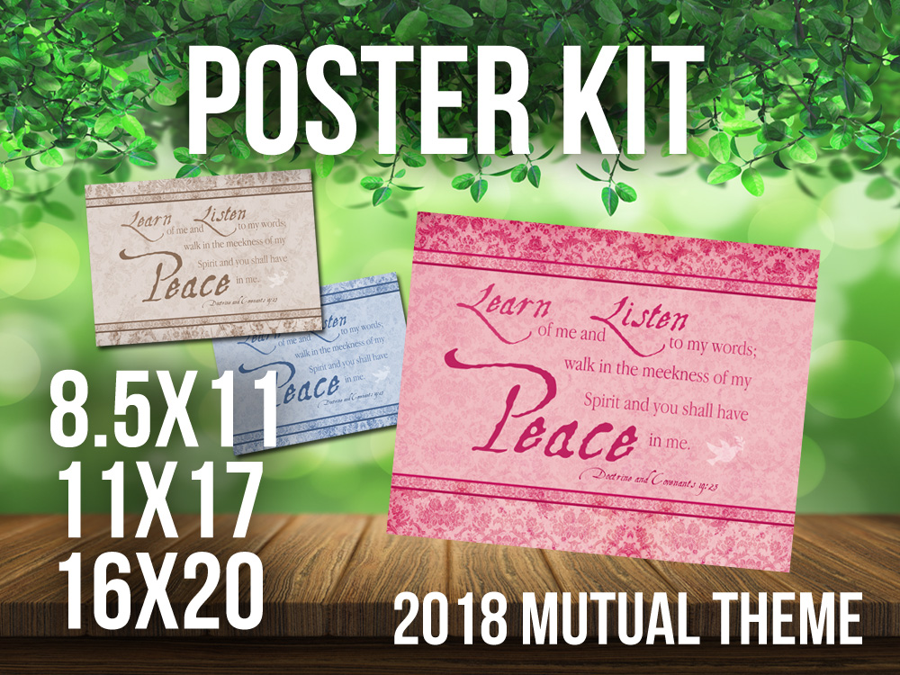 2018 Mutual Theme Poster Kit. 3 Styles in Hi Res JPG. For LDS Young Women. D&C 19:23. Peace in Me. 8.5×11, 11×17, 16×20 300 dpi w/ dove