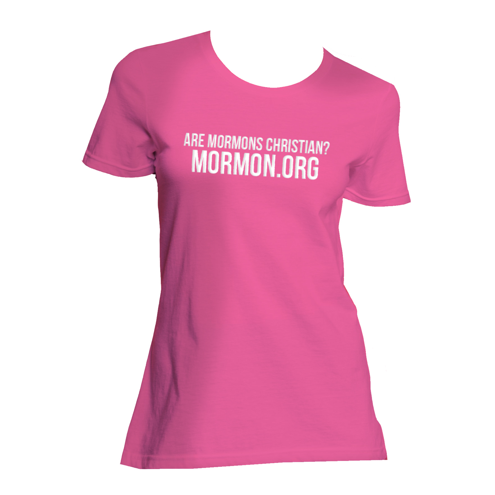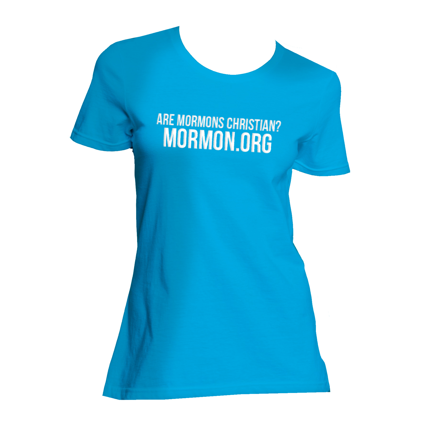 Are Mormons Christian T-Shirt – Women’s fit. This bold T-shirt addresses a common misconception about Mormonism, but directs viewers to visit Mormon.org to get the truth. You choose whether white letters are on the front or back of the shirt.