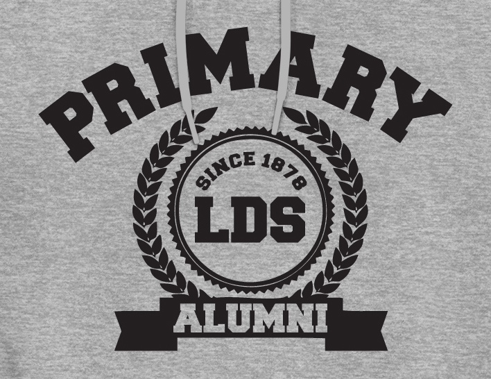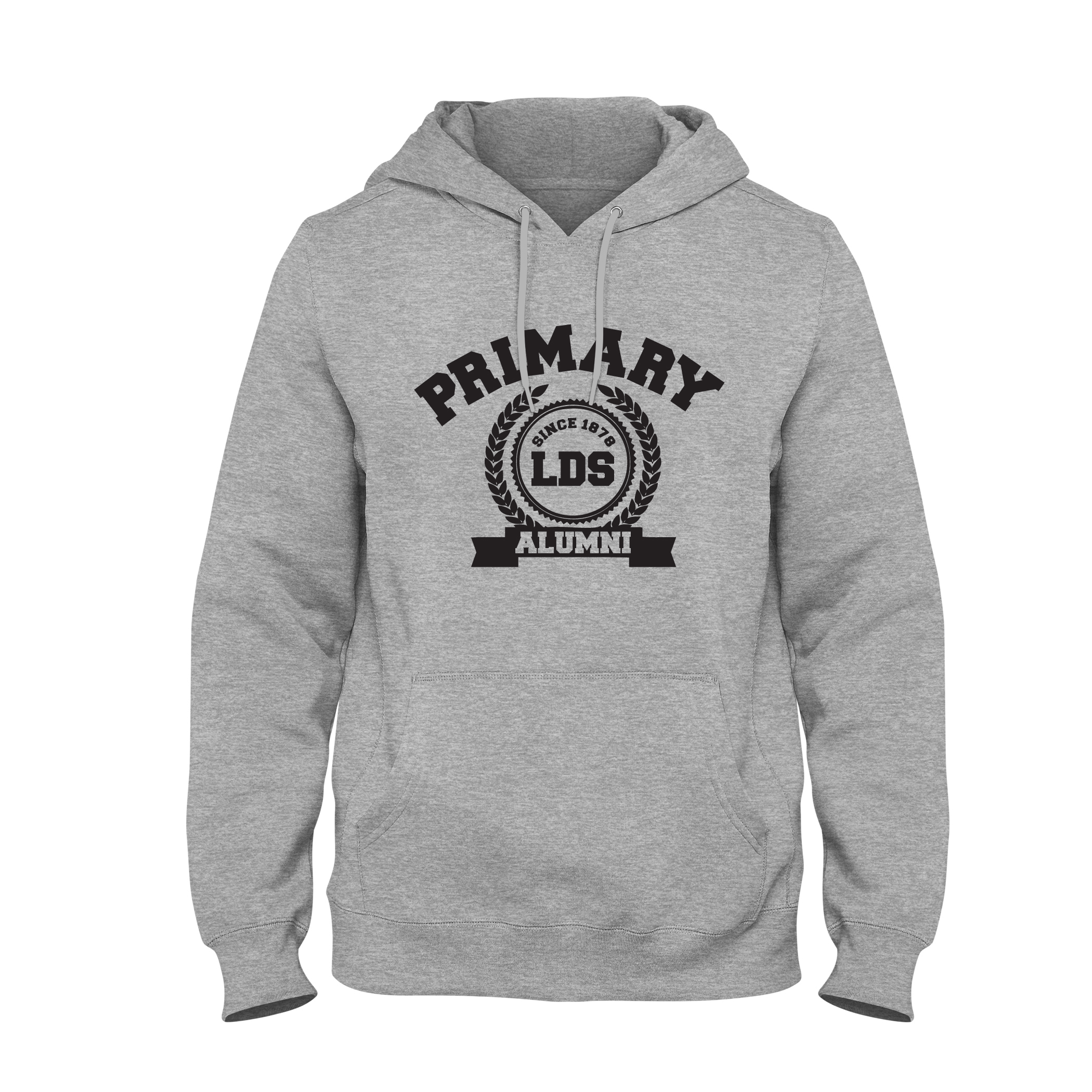 LDS Primary Alumni Pullover Hoodie with handwarmer pocket comes in Heather Gray with black lettering. Unisex sizing is for men and women who prefer a looser fit around the waist.