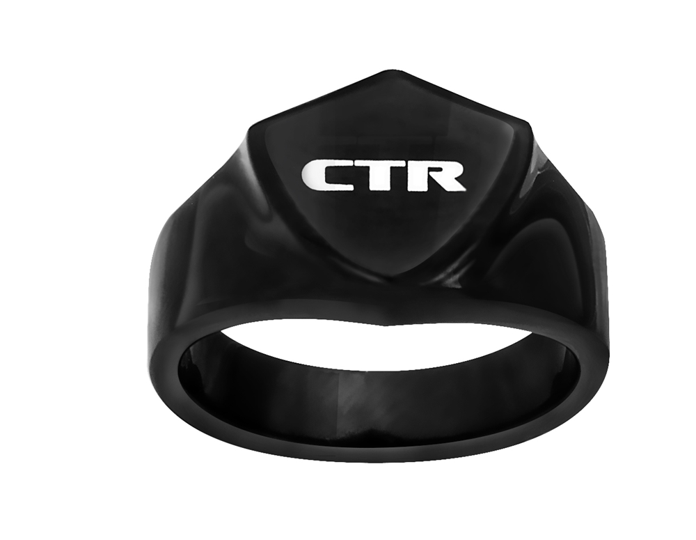 Solo CTR Ring is a great gift for any man or teenage boy. Cool wide band CTR ring with traditional shield in black steel. Comfort fit band. Stock Sizes 8-13.