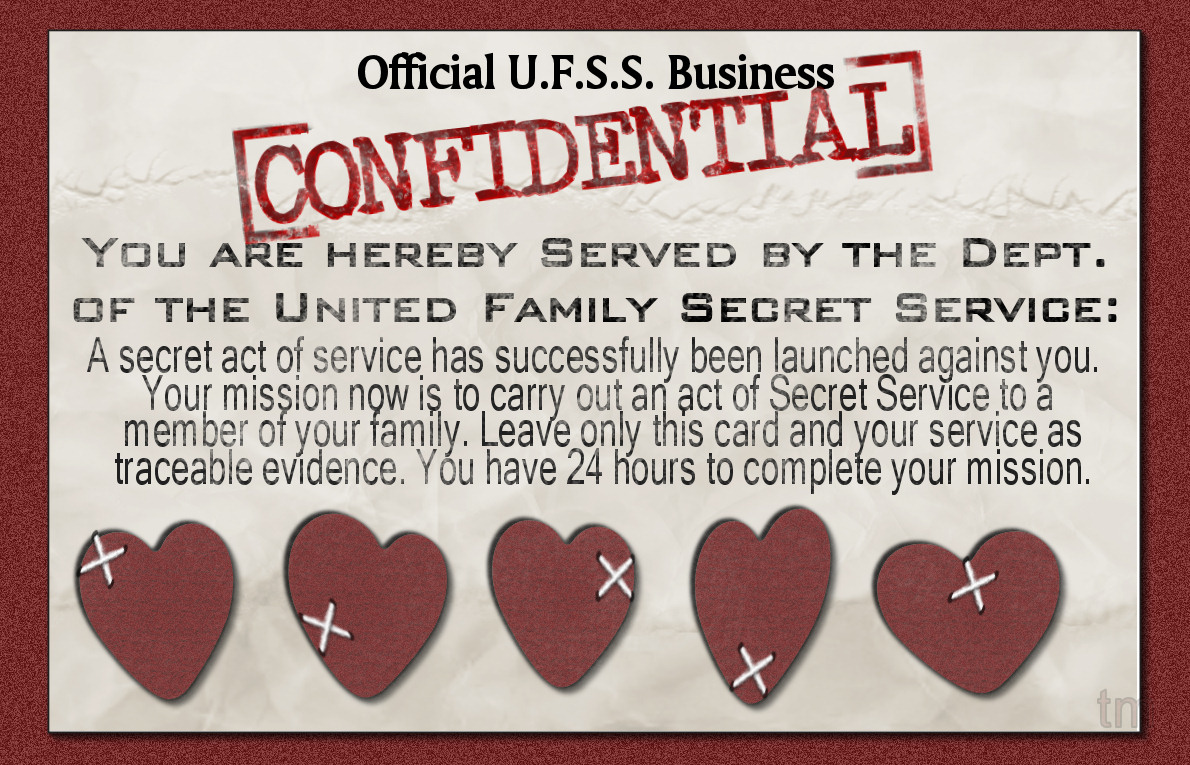 An act of service has sucessfully been launched against you. Your mission now is to carry out an act of Secret Service to a member of your family. Leave only this card and your service as evidence. You have 24 hours to complete your mission.