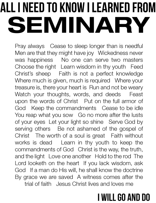 Back in the day, apparently, there was a poster available that played off of the All I need to Know I learned from Kindergarten fad of the nineties, tweaked for Seminary. Our Seminary Facebook group was unable to find the original, and since church was canceled due to ice today, I’ve got time to make a few versions. Click on “All I need to Know” in the tags to see all these posters.