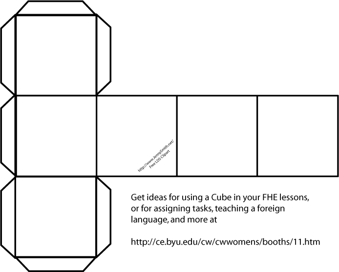 This is a blank box or cube pattern. You can use this to make your own games, assign housework, or teach concepts. There are several ideas at the BYU Women’s Conference Booth Handouts page.