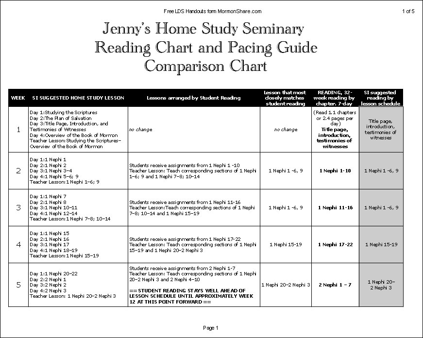 My pacing and lesson chart shows the correlation (or lack thereof) between Seminary lessons and student reading. It includes a student reading chart by week. The reading chart has been paced to require approximately the same amount of reading per day, which in the case of a 32-week course is just 10 minutes per day on a 7 day week, or 15 minutes in a 5 day week. I’ve included suggestions on how to alter the lessons in the manual to fit with student reading better, which is how I pace my lessons for my daily Seminary class. In my Seminary class I’ve found that when students are all together in their reading, they participate better during class because the lesson material matches the questions they have about their reading. I’ve also found them more likely to read their scriptures and complete the course. The same principles should hold true in a home study course.