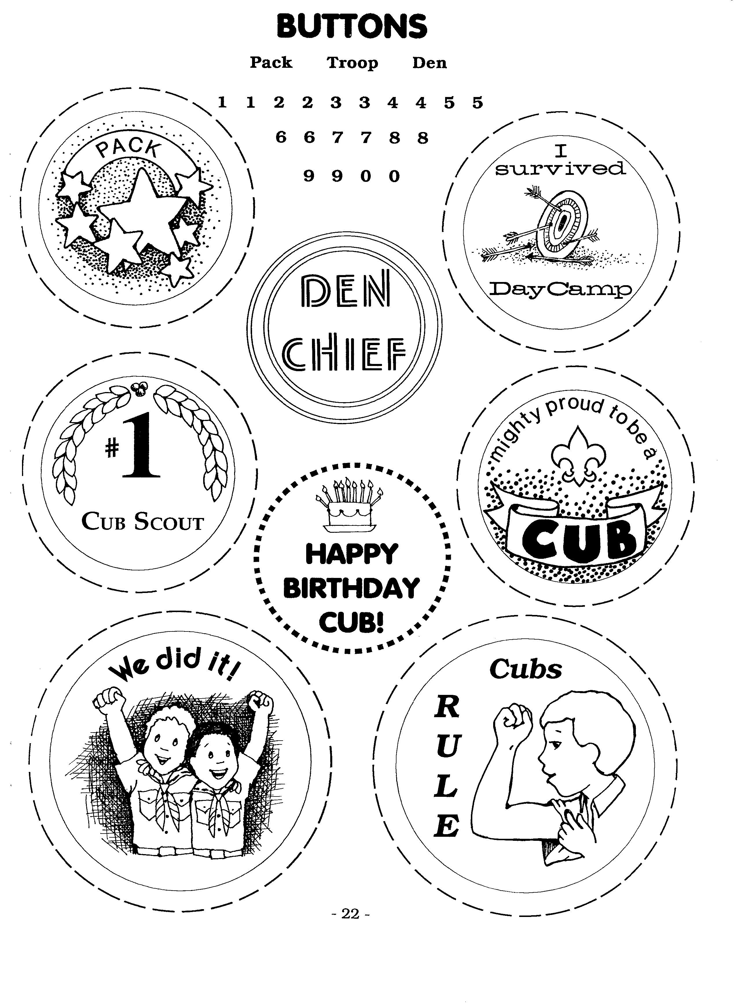Our button/badge page consists of four small and two large designs, as well as two alternates. This art can be sized to fit all standard buttons. The dotted line allows sufficient margin for folding under. Another alternative (if you cannot use a button machine) is to photocopy on card stock,