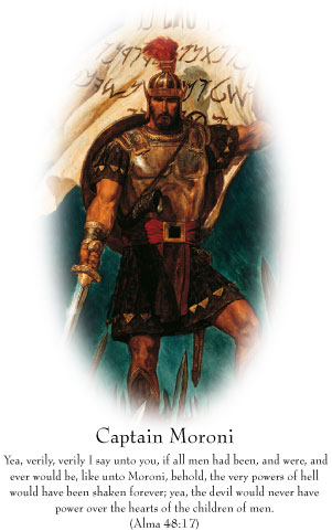 This is LDS program cover art with the image of the Captain Moroni and the Title of Liberty from the Gospel Art Picture Kit and the scripture from Alma 48:17.