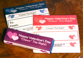 It says “Happy Valentine’s Day ‘Chews’ The Right” on the front. On the back is a blank for you to fill in “To” and “From”.