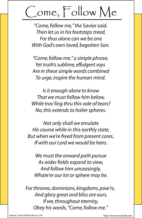 This poster has the lyrics to Hymn 116, Come, Follow Me.