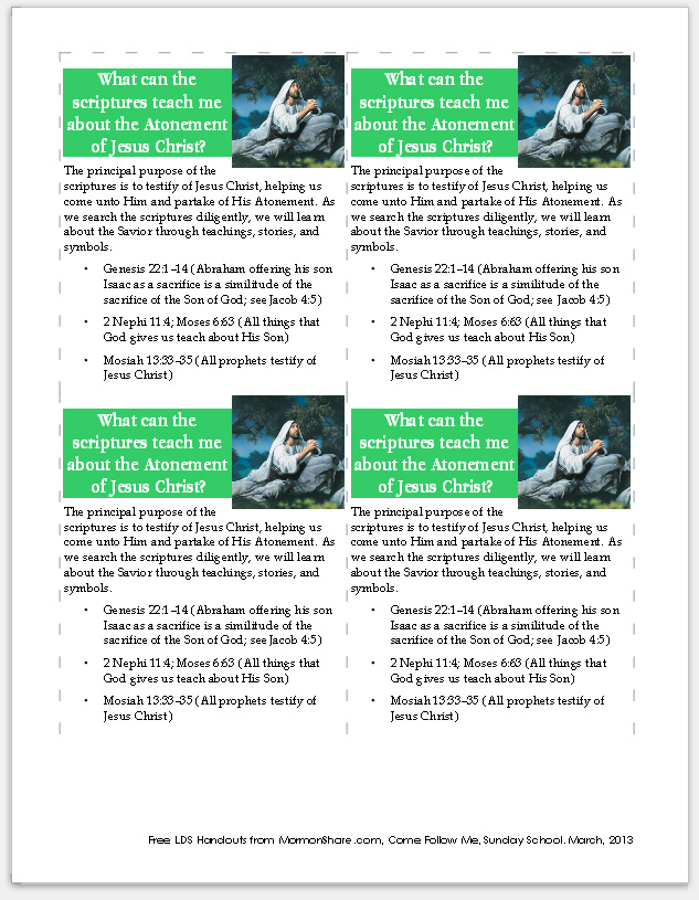 Here are some Come Follow Me Weekly Reading Assignment cards for Sunday School. These are for March 2013’s CFM lessons on the Atonement. There is a card for each of the weekly lesson topics. Print enough copies of the page so that each member of your class can have a card to take home. What you’ll find on each card: