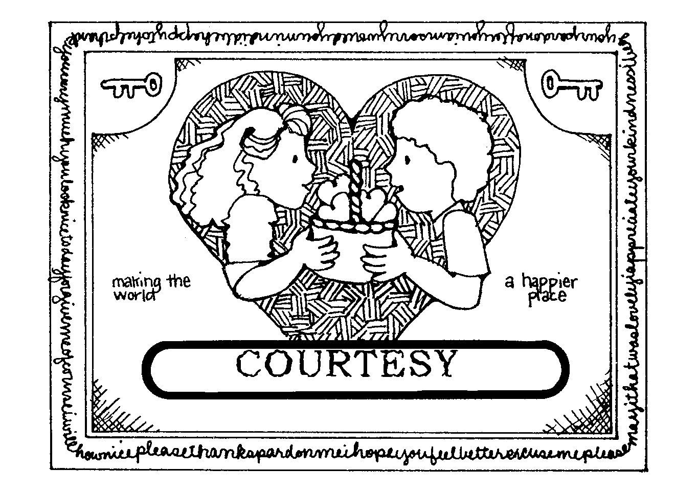 Courtesy is the key to making the world a happier place. Has several courteous phrases in cursive around the border.