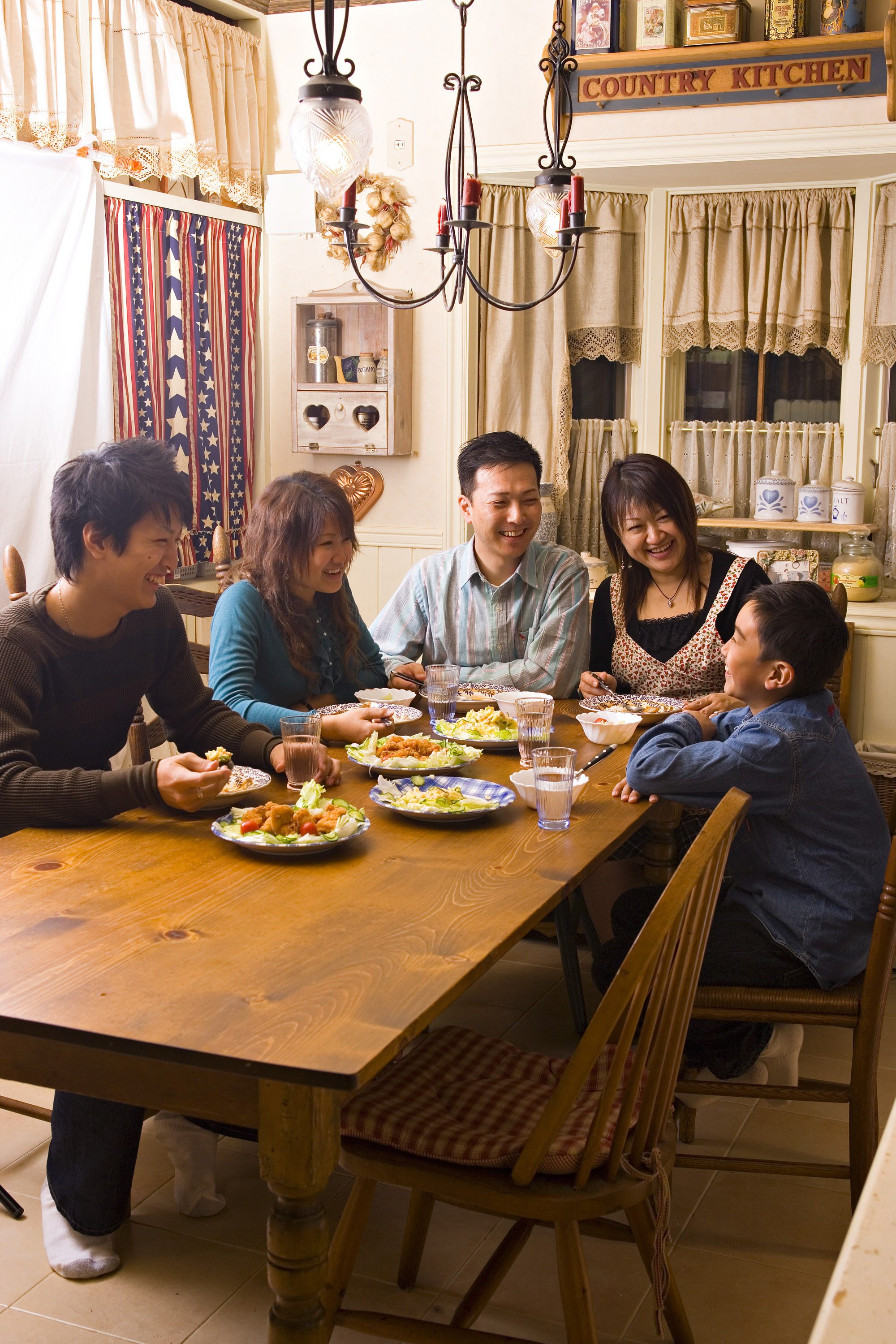 An ethnic family, with older children, eating dinner.