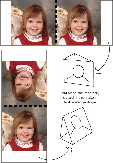 Print out two pictures of each child, touching each other, either side by side or with one upside down. Leave a little space on the end of each picture to act as a base. (You’re going to fold these pictures in the shape of a tent or wedge.) The photos must be no larger than 2 inches tall by 2 inches wide (50 cm x 50 cm). See diagram below: