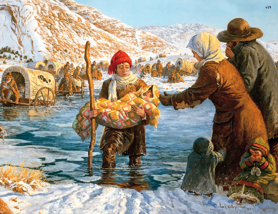 The Martin Handcart Company heading west in 1856 was caught in Wyoming by the early arrival of winter weather. Many would die before they reached the Salt Lake Valley. A rescue party sent by Brigham Young met the company and helped get them through. One especially difficult part of the journey was the crossing of the Sweetwater River. Cold and hunger had left the pioneers weak, and the crossing seemed impossible. However, men from the rescue party, some only teenagers, bravely stepped forward and carried many members of the company across the icy water. This heroic act was an inspiring moment amid the tragic experiences of the Martin Handcart Company.