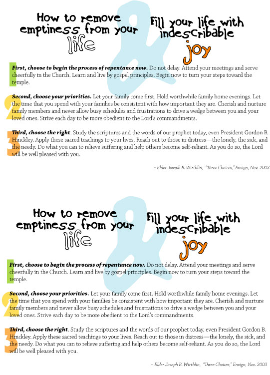 Handout with a quote from the Joseph B. Wirthlin article suggested in the 2004 Resource Guide for YW Manual 2, Lesson 28: Agency. I titled it “How to remove emptiness from your life and fill your life with indescribable joy”.