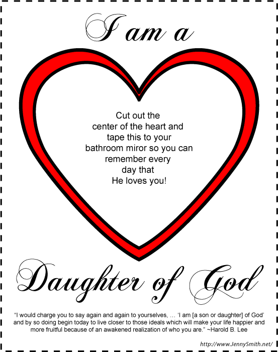 This sign has a heart with a center that should be cut out. Tape the sign to a mirror, and repeat “I am a Daughter of God” every day to remember your Divine Nature.
