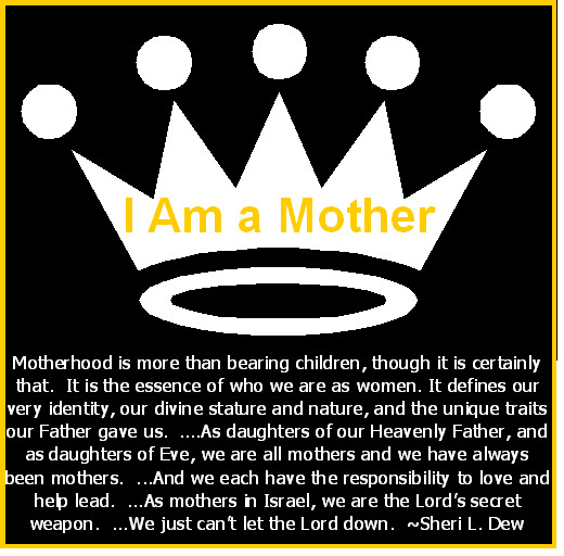 “Motherhood is more than bearing children, though it is certainly that. It is the essence of who we are as women. It defines our very identity, our divine stature and nature, and the unique traits our Father gave us. … As daughters of our Heavenly Father, and as daughters of Eve, we are all mothers and we have always been mothers. And we each have the responsibility to love and help lead … As mothers in Israel, we are the Lord’s secret weapon. … We just can’t let the Lord down.” (Sheri L. Dew, “Are We Not All Mothers?” Ensign, Nov. 20)