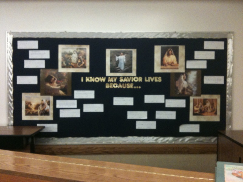 This is the bulletin board in the Primary room of a building I visited this week. It has the Primary theme with the word because and pictures of the Savior along with slips of paper where each child has written how he or she knows the Savior lives.