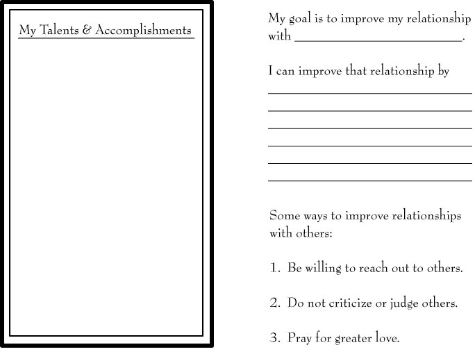 This handout is made to accompany Manual 3 Lesson 43: Associations with Others. It has a space for the writing activity suggested in the lesson, and a space for writing down ideas for accomplishing the end of the lesson challenge.